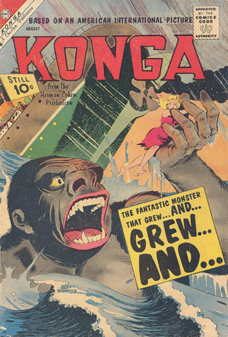 On the opposite end of the quality spectrum is Konga. At the time of its initial release, this movie didn't play at a theater near me, so I settled for reading the comic book based on the film. The film was produced by Herman Cohen, a name associated with several beloved, if dubious cinematic achievements. Maybe I'm reading more than intended but Konga begins with Michael Gough vigorously stroking his monkey. As the scientist looking for a link between animal and vegetable life, you know that Gough is questionable when it is revealed his relationship with his female assistant (Margo Johns) is platonic. Even more alarming are the man eating plants Gough has brought back from Africa along with the monkey. In addition to the usual venus flytrap type plants, some other plants resemble giant black veiny penises. For reasons not made clear, Gough wants to experiment with the monkey Konga to make him larger. His lab assistant accidentally spills some of the formula and the house cat catches a couple licks. Gough grabs a conveniently placed pistol and shoots the cat, insuring that Kong will be in the PETA Hall of Fame. Gough finally tests his formula, and we witness the monkey grow into a baboon and eventually into a man in a really bad gorilla costume. Gough hypnotizes the gorilla to strangle various people that are in his way. Gough also has designs on making a young student played by Claire Gordon his new lab assistant. Gordon's feelings for her teacher are hardly reciprocal as indicated when Gough tries to swallow the tonsils of the object of his unwanted affections. Johns, the jilted non-lover, gives the gorilla a heavy dose of the growth formula only to become the first victim of the ever growing ape. Little effort is made to disguise the fact that Johns is replaced by a dimestore doll in some shots. The giant Konga bursts out of the basement lab, snatching Gough in one hand. Gordon is last seen having an arm chewed up by a man-eating plant. Gough takes on the Fay Wray role, being squeezed like a tube of toothpaste, while casts of dozens run in panic on the London Streets. King Kong has the Empire State Building, while Konga has Big Ben, not to climb on, but just as part of the scenery. The giant Konga, who doesn't appear until the last fifteen minutes, is killed by a hail of bullets after tossing down a "Ken" doll that substitutes for Gough. How bad are the special effects? Let me just say that I had a newfound appreciation for the magic of Bert I. Gordon.